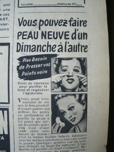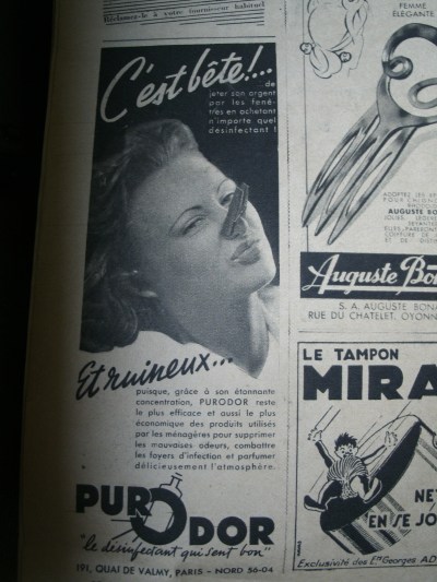 The price on the front of this magazine is 10 Francs. I’ve found -via Wikipedia; admittedly, it might not be accurate – that in 1945 480 francs were equivalent to one English pound. I’m not particularly mathematically minded, so I figured out that the magazine cost 0.02 of a pence. Can that be right? I paid 50p for each one…