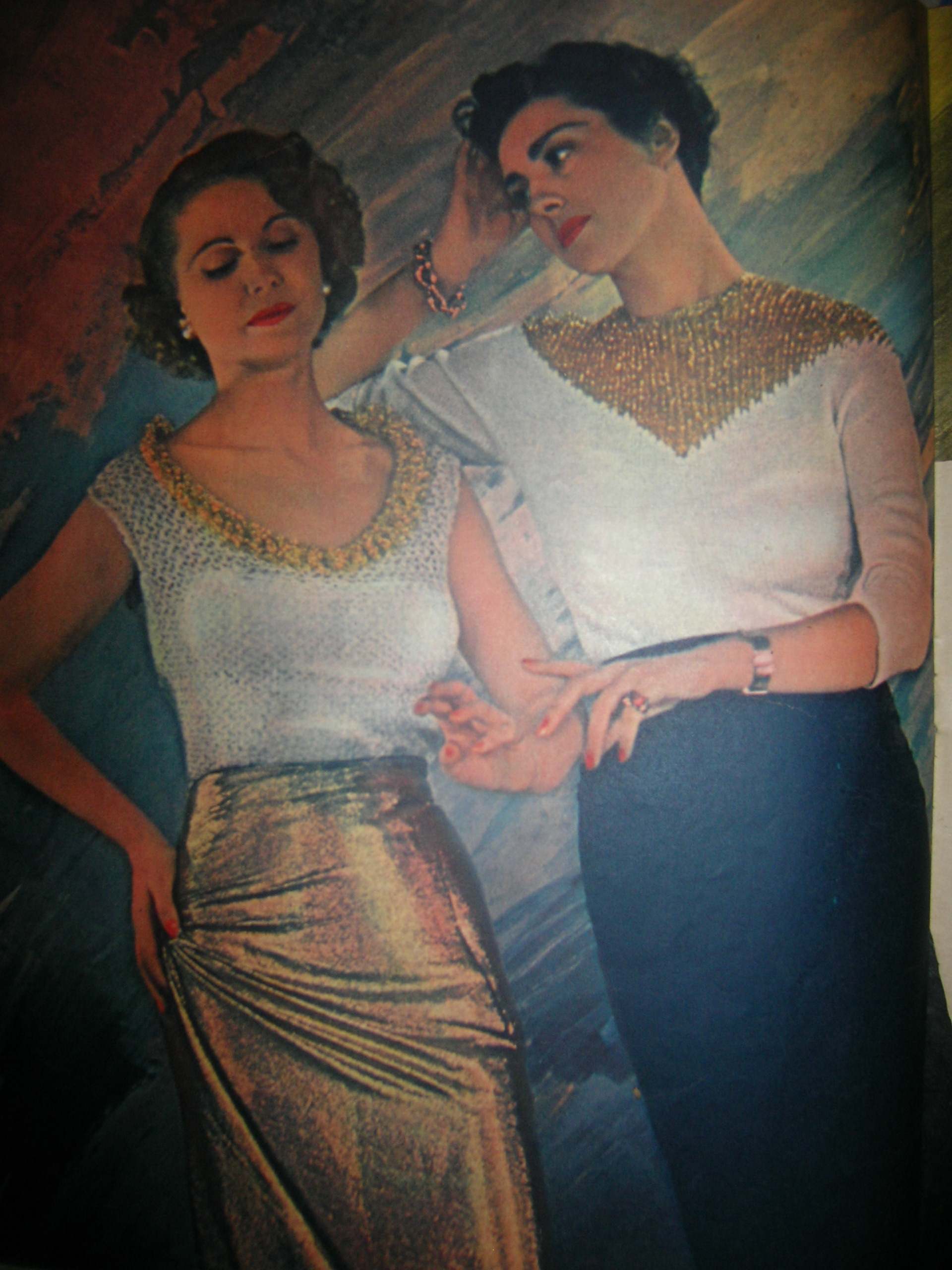 I love love love this! How did you get your hands on these beautiful magazines?!? I love the gold pencil skirt with the white boatneck top, trimmed with gold. Clothes today just don’t have the same drama. Sigh…