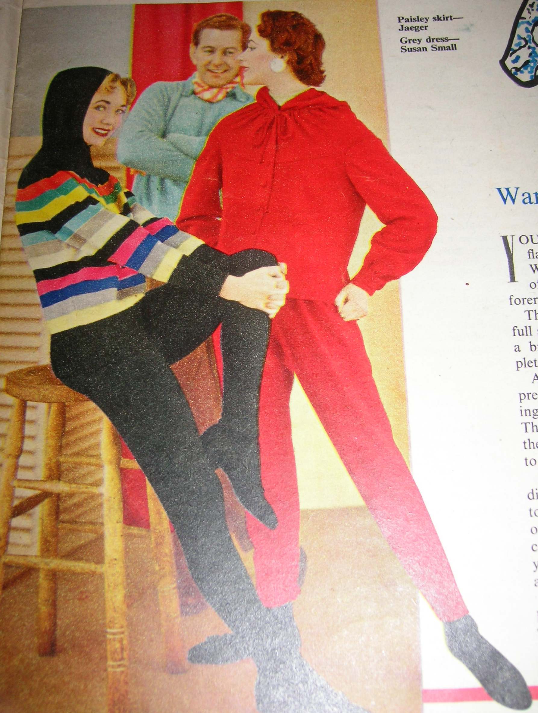 Did anyone else spot the Americanisms in that? Pants, slacks, recognize – what was going on? Also, some of the fashion ideas seem to be somewhat similar to today’s fashion: Paisley knitwear, full skirts and strange shaped trousers!