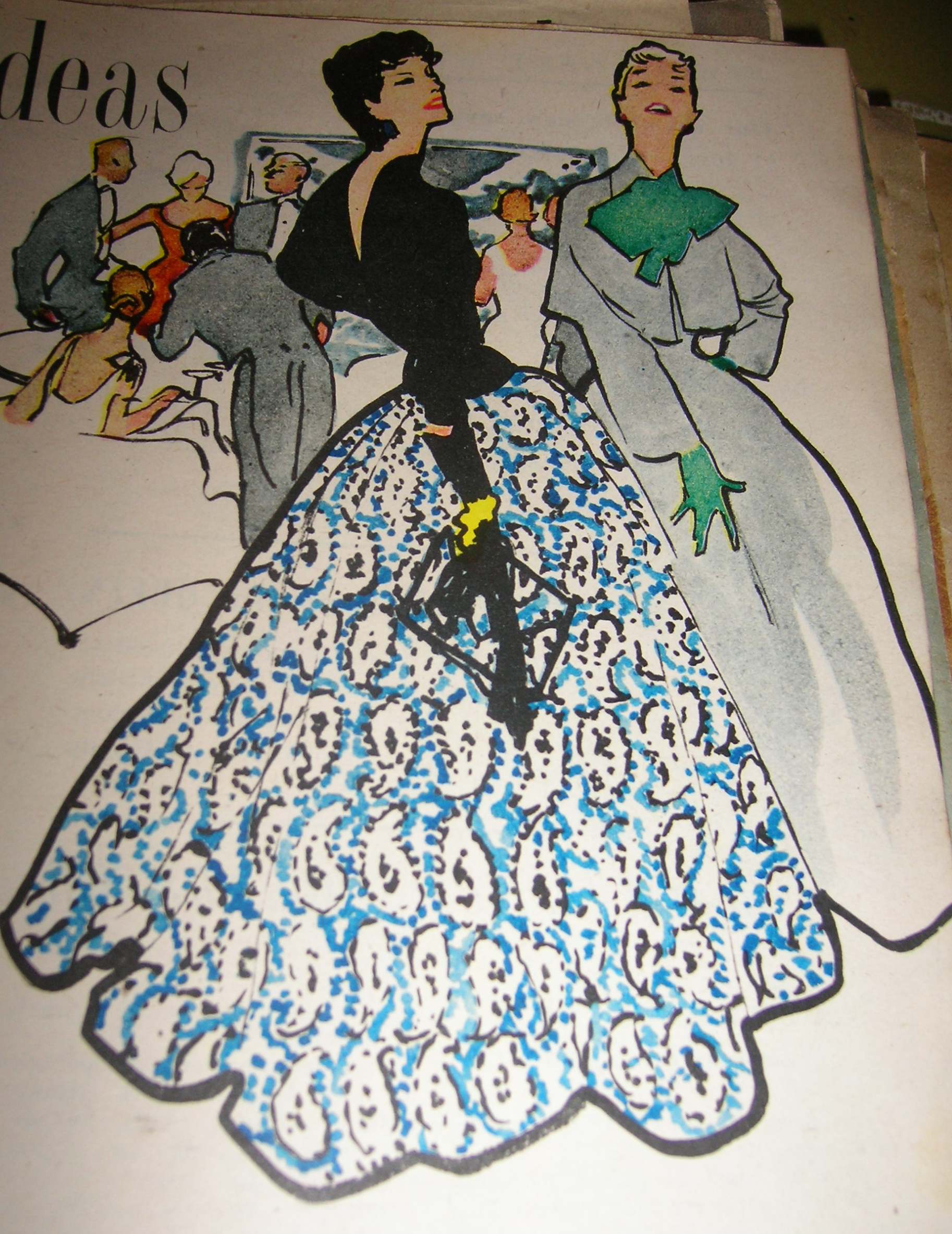 “Jewellery with these new evening fabrics should be chunky, and gold or silver kid is the best choice for belts and handbags. And do please be sure to wear plain, plain shoes.” (p.11)