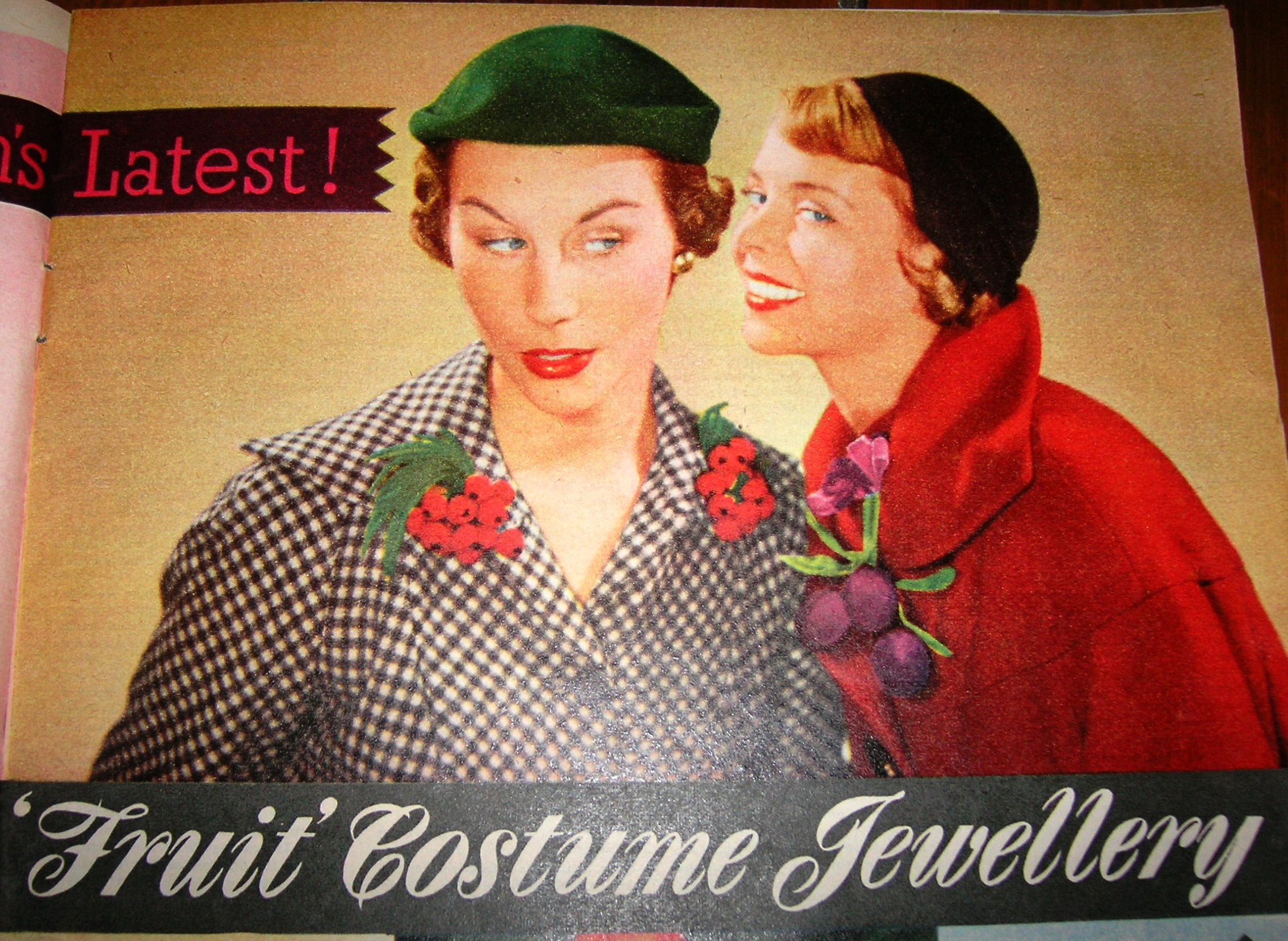 Not that I’m particularly fashionable, but I do love this ‘latest’ idea from 1952: fruit inspired costume jewellery.