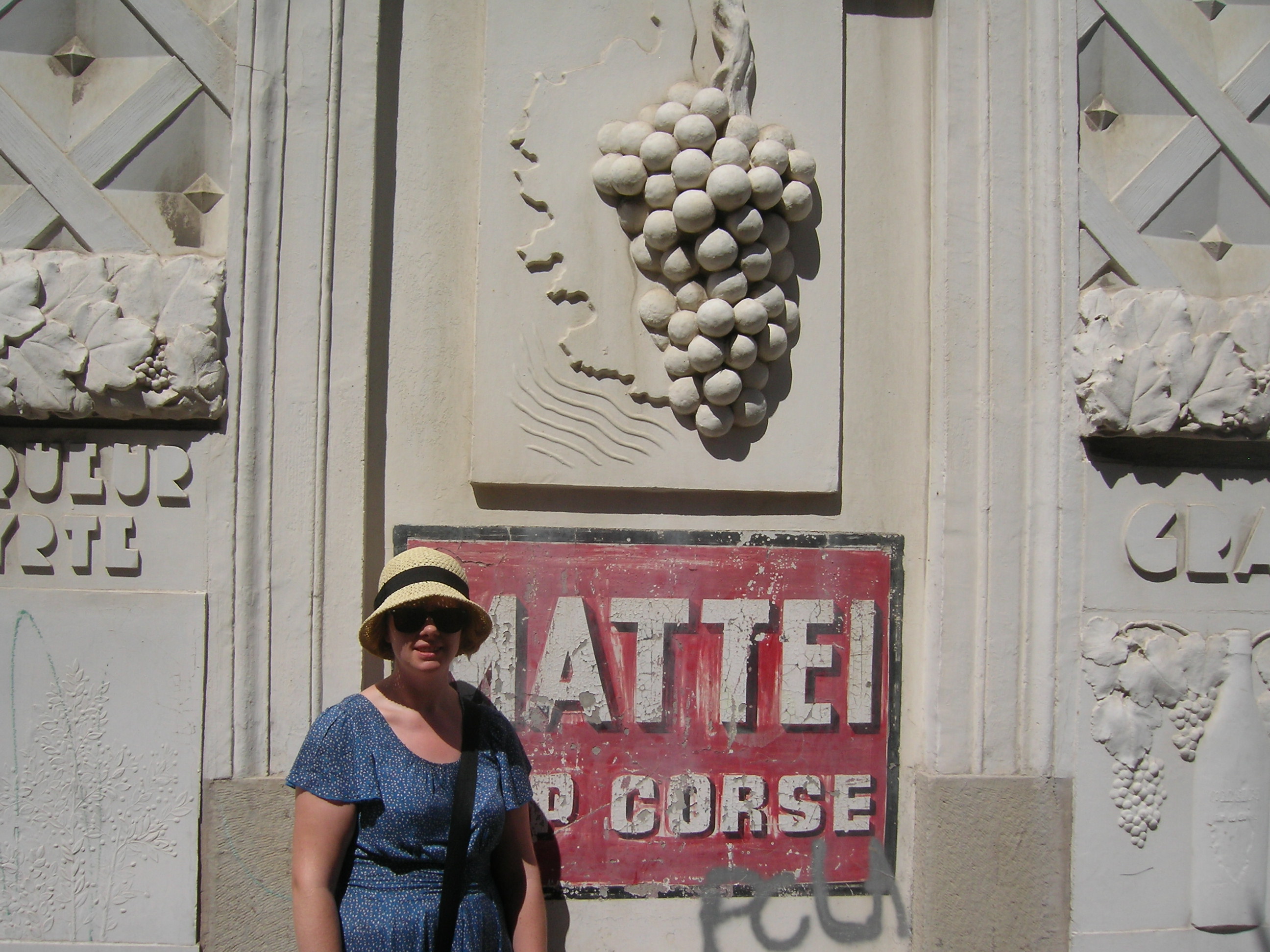 I am the stereotypical British woman – very pale, slightly ginger and a complete pear shape… as pointed out by the major of the town we stayed in when he was having lunch with our host and spotted us on the beach! Nice to know I stood out that much amidst the sea of berry-brown people (to use an Enid Blyton phrase!). Anyway, here I am modelling an art deco facade to a wine shop for you. We spent a while looking for an art deco building mentioned in the guide book, only to find it was the building we’d already taken a picture of…