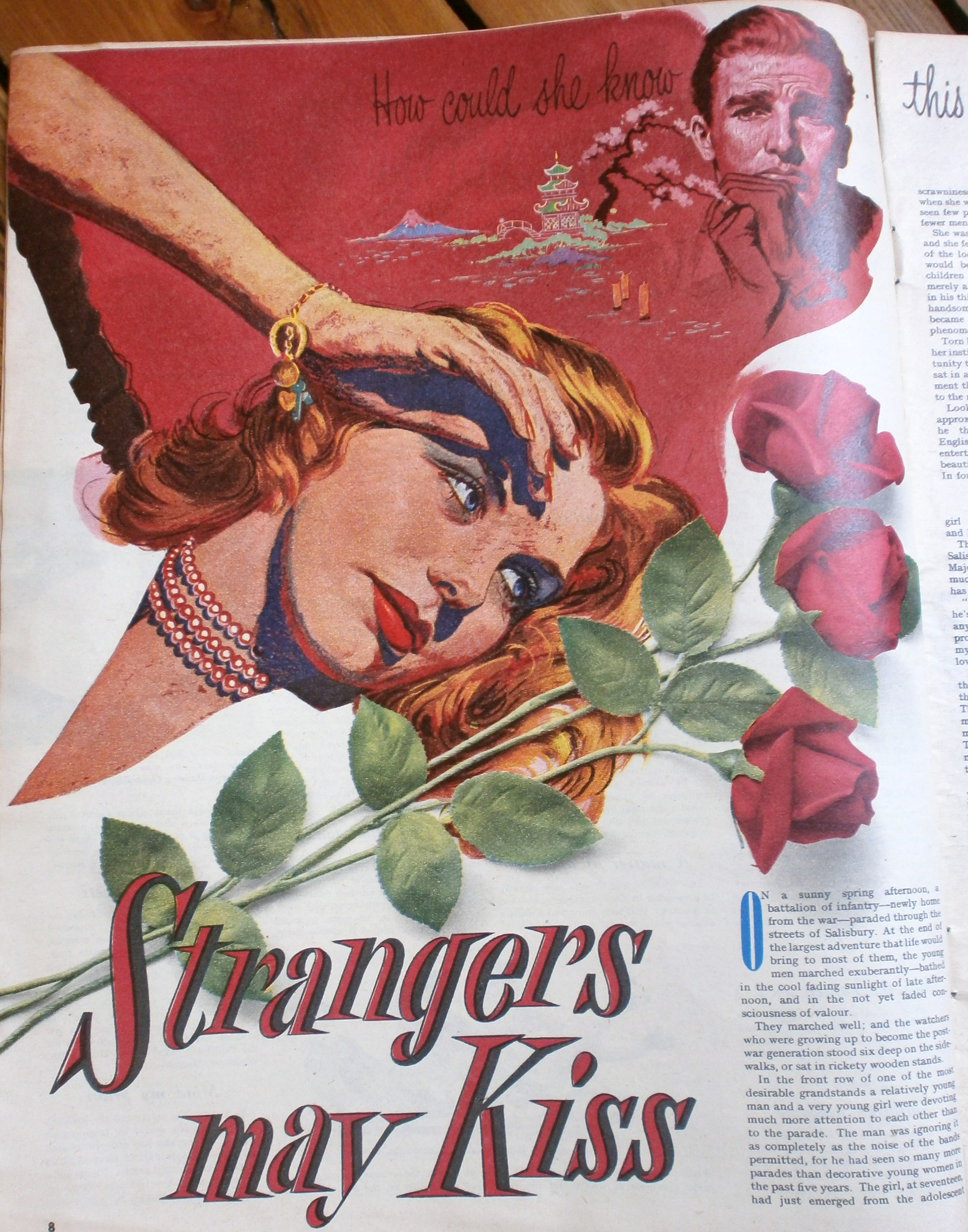 Neither of these show a kiss, and ‘Strangers May Kiss’ looks different in style and intensity of colours used to me. Note the charm bracelet the woman is wearing – very fashionable in the 1950s.
