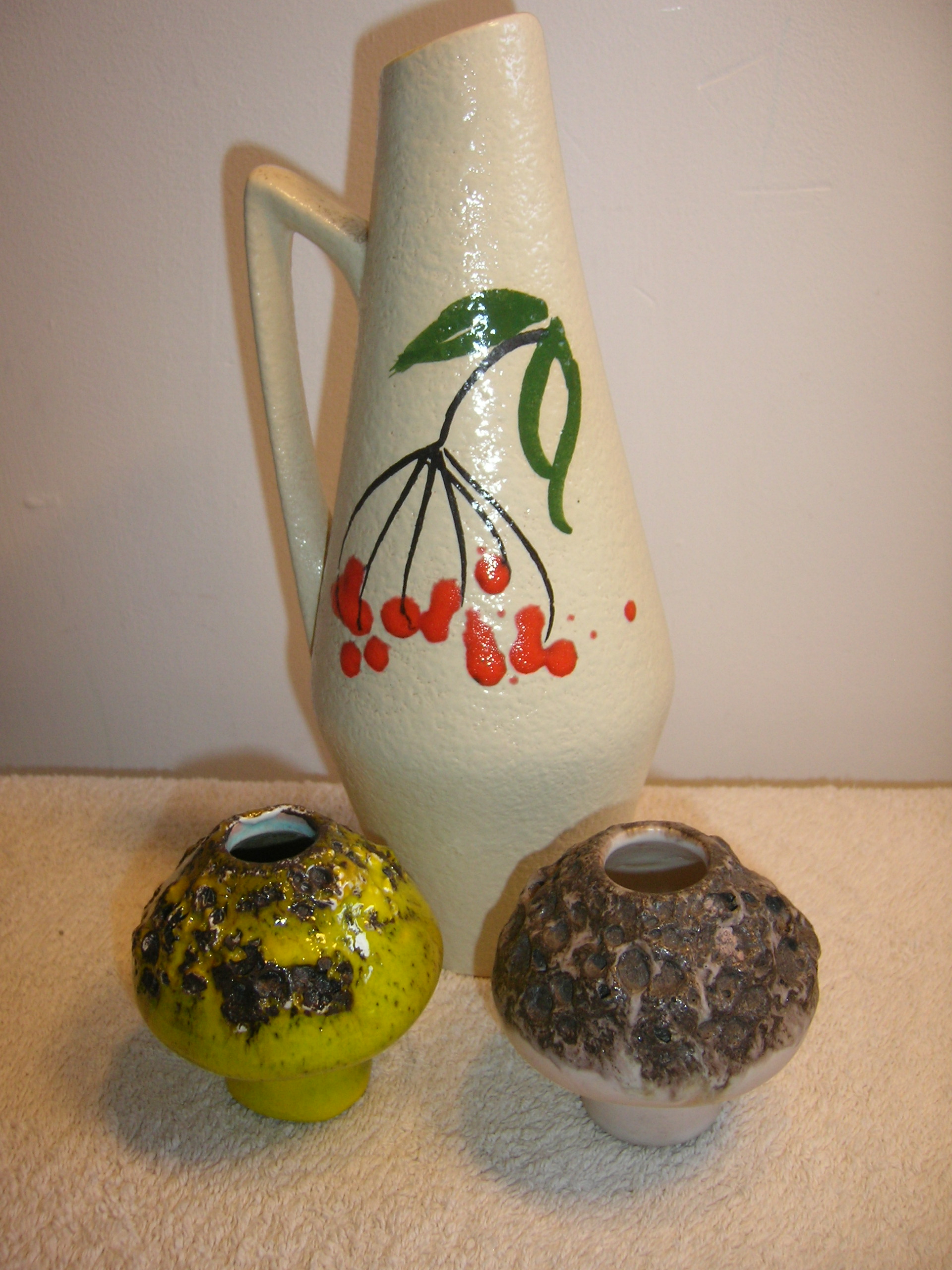 The red one on the right is made by Steuler, but I’m not sure about the one on the left. It could be a Bay Keramik, it has that look about it.