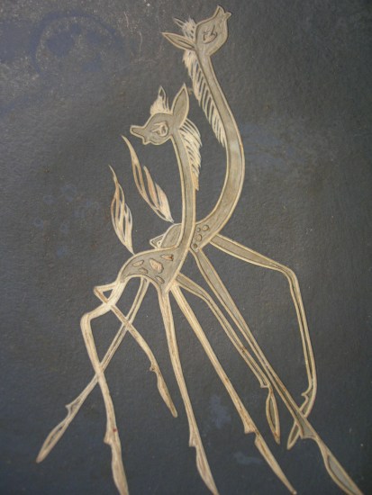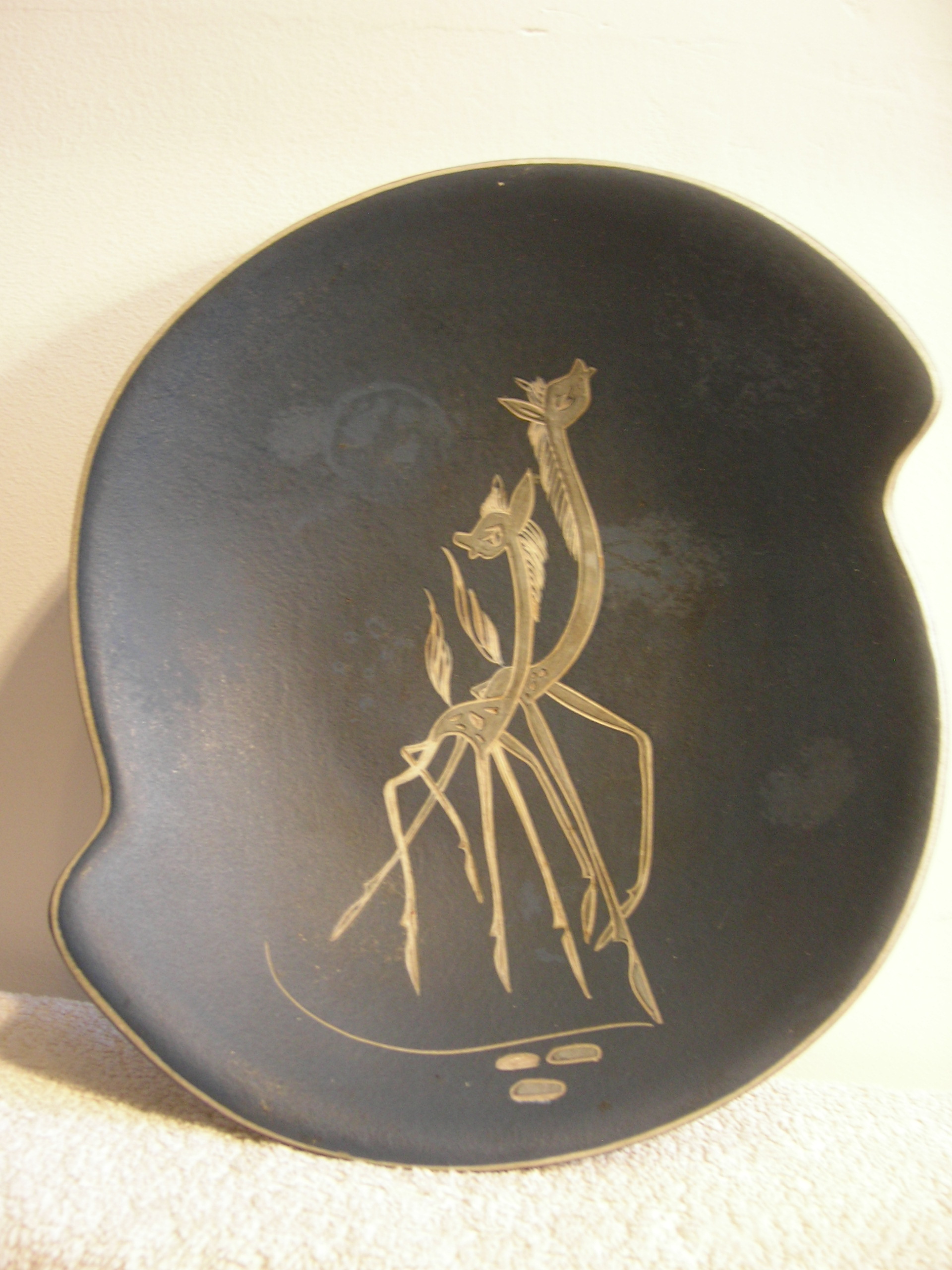 Is it a horse? is it a deer? Is it a giraffe? Is it some strange hybrid of the three? I’m really not sure, but I do still like this little 1950s plate very much. The elongated necks and legs of these creatures, when coupled with their cheeky chirpy faces, create the cutesy kitsch feel of the 1950s. *Update* Aidan has just entered the room and mocked me considerably about this – apparently, they’re clearly giraffes. Fine then. Whatever. They’re giraffes.