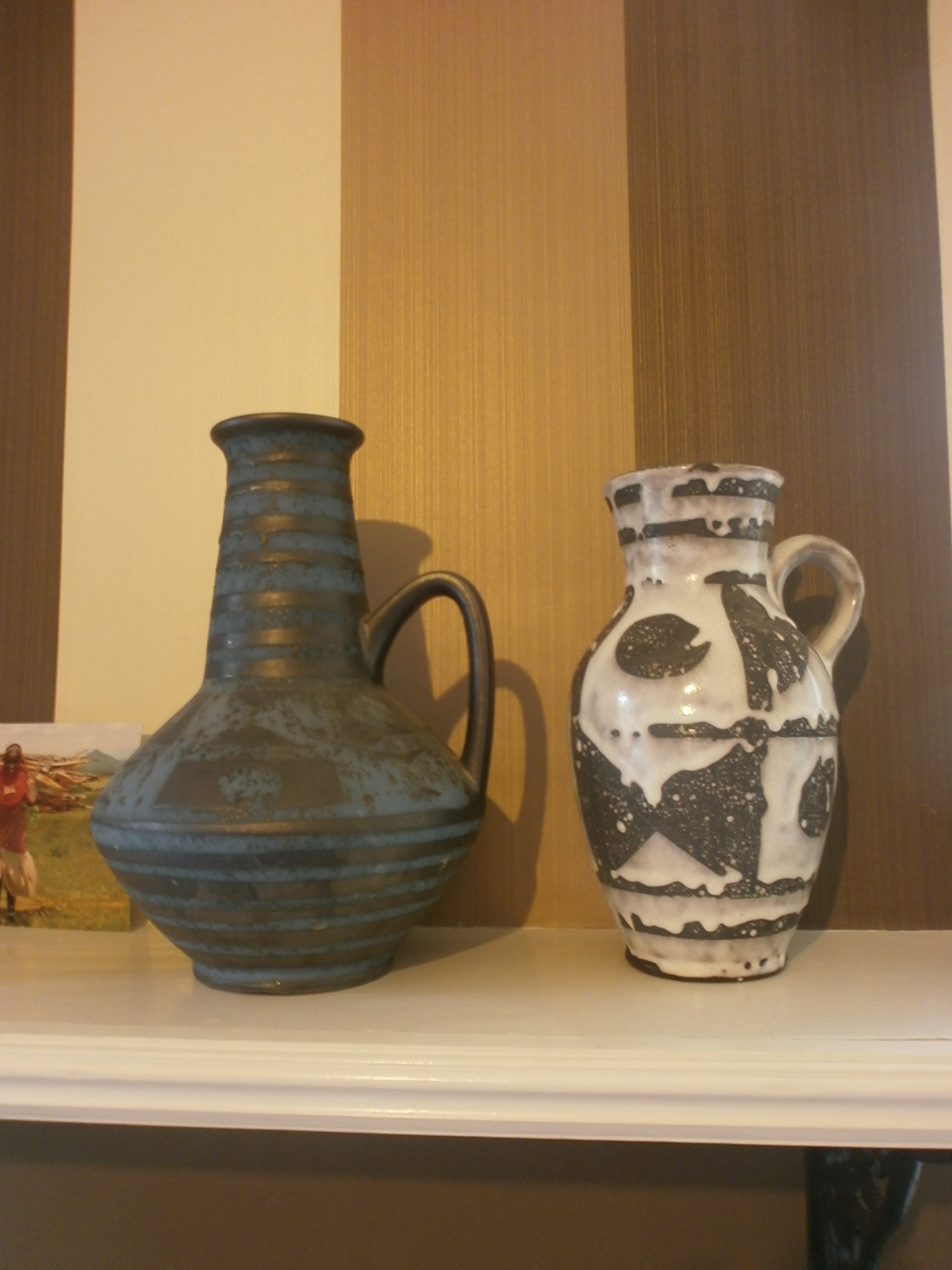 The black and white West German pot on the right is in the Ankara glaze by Carstens. I love it! I collect this glaze; mostly the collection is built up from the more common blue and black style. This means I now have one red and black, and one white and black. The glaze on this is constructed slightly differently: it has the black underneath the other colour, rather than on top of it like the blue and black version.