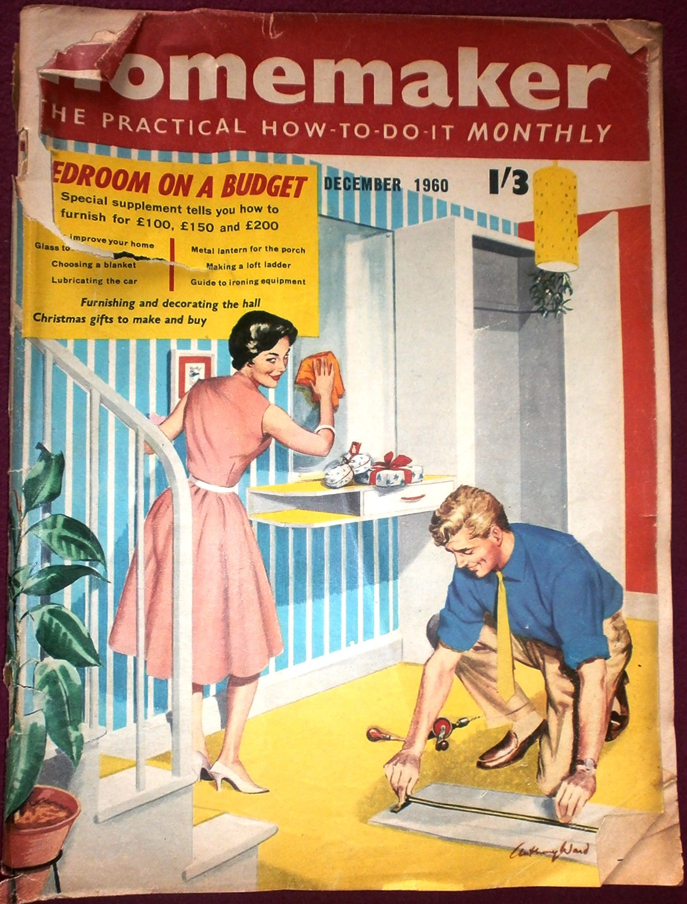 The two magazine covers above show two different approaches to home improvement as a couple in the 1950s. The first picture shows the wife assisting her husband, whilst wearing full makeup and a lovely set of pearls. The second picture shows the wife performing tasks herself, wearing more appropriate garb. Initally, when I looked at these, I thought, “I’m offering neither assistance nor help,” in the way these two wives are. What does that mean? Should I be at Aidan’s side whilst he fixes, saws, hammers, nails, curses and creates?