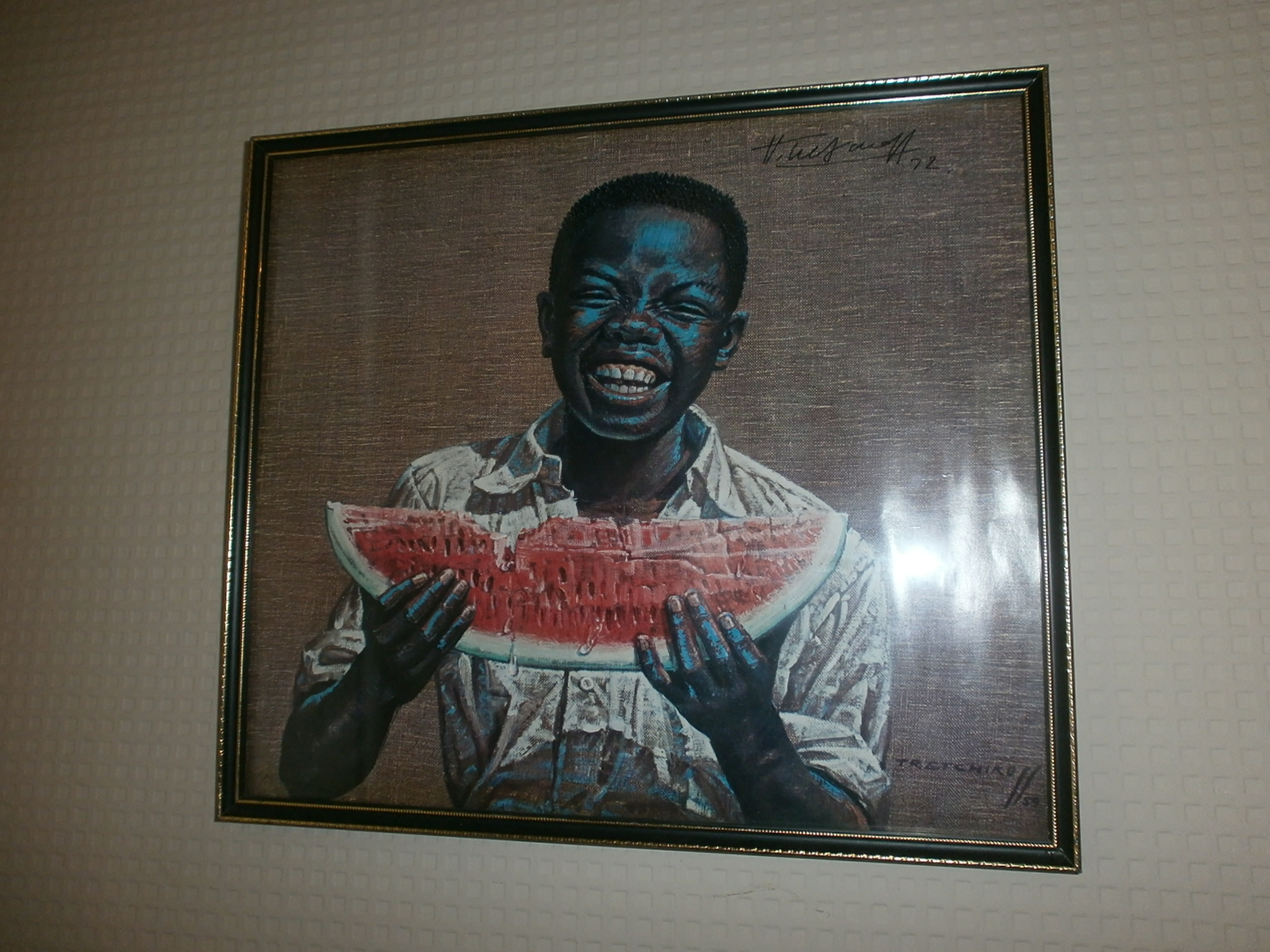 Like all of the retro and vintage things we own, I did the usual quick internet search to see what I could find out about the ‘Melon Boy’ print before posting it. It seems that this particular picture is one of Tretchikoff’s more controversial. See here and here for two sides to the debate. In a nutshell, this painting, and others by Tretchikoff, has been criticised as a racist piece of work. The connotations of a young black boy with a watermelon are possibly lost on a white woman from England, but many people in America – where the associations are the strongest it seems – find this picture and its peers uncomfortable viewing. The curator of the Tretchikoff exhibition in South Africa, Andrew Lamprecht, argues that these associations are not apparent in South Africa (as in England), and if anything, Tretchikoff ‘was accused of critiquing the government’s policies’ (http://www.mahala.co.za/art/deadly-serious/, 5th July, 2011) through his paintings.