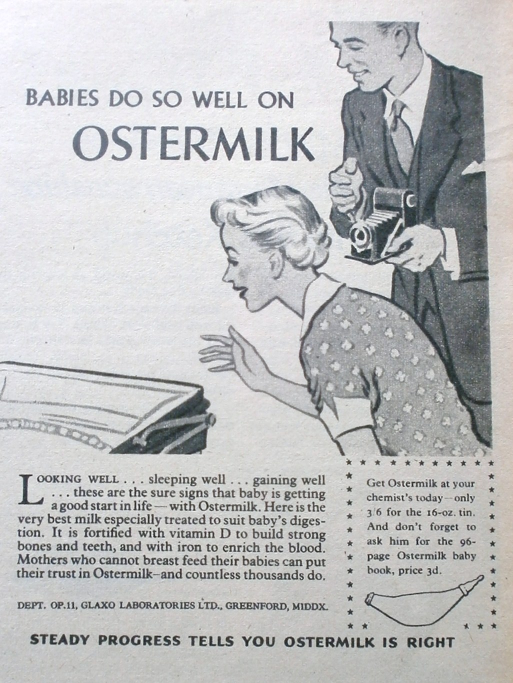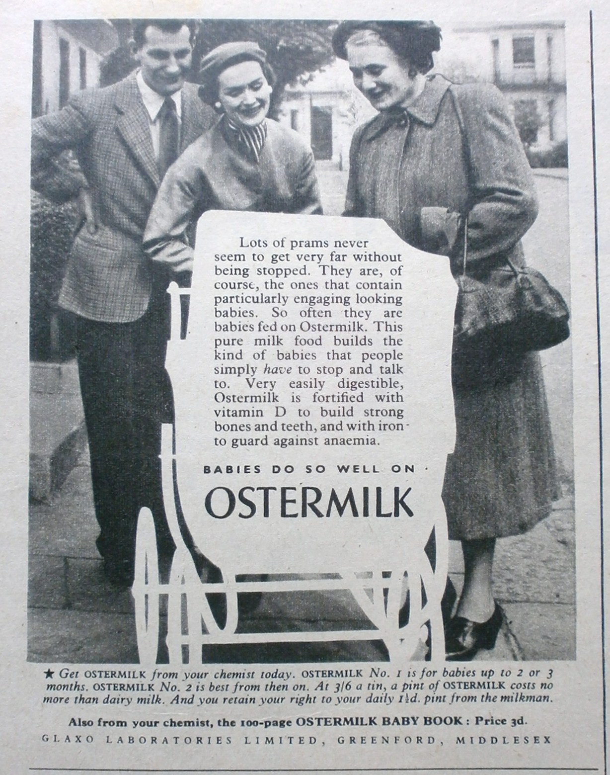 Just read the different in the copy between the adverts. The first states that for ‘Mothers who cannot breastfeed [they] can put their trust in Ostermilk.’ So far, so responsible. Yet look at the text for the second advert: “Lots of prams never seem to get very far without being stopped. They are, of course, the ones that contain particularly engaging looking babies. So often they are babies fed on Ostermilk. This pure milk food builds the kind of babies that people simply have to stop and talk to.” As I said, designed perfectly to play on fears and competitiveness. The breastfeeding vs. formula feeding debate still rages on endlessly nowadays, and there is an absolute wealth of information out there for mums and dads to be read about. It really is down to personal choice and circumstances, in my opinion, and I don’t think any parent should be made to feel guilty about that choice.