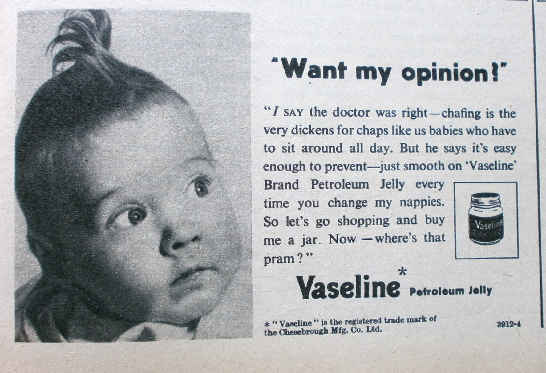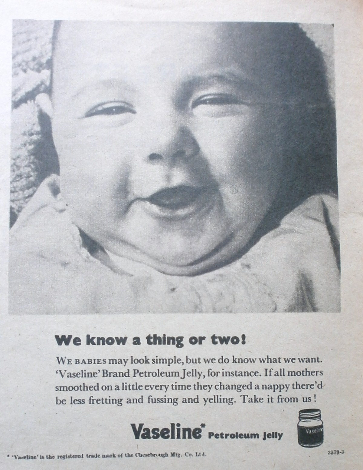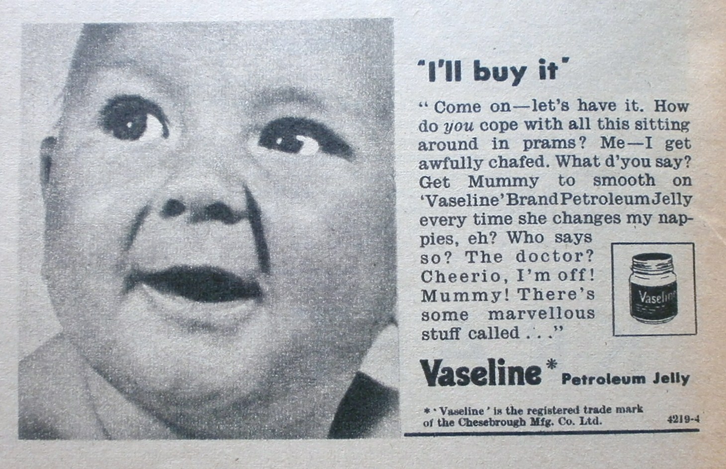I love the expressions on the faces of the babies in the Vaseline adverts and the RP accent of the text. Jolly good! The idea of my baby thinking in a posh accent tickles me somewhat. In reality, it’s likely to be a strange hybrid of Yorkshire, Mancunian and the Midlands. Perhaps I can teach him or her to say, “I say!” at least.