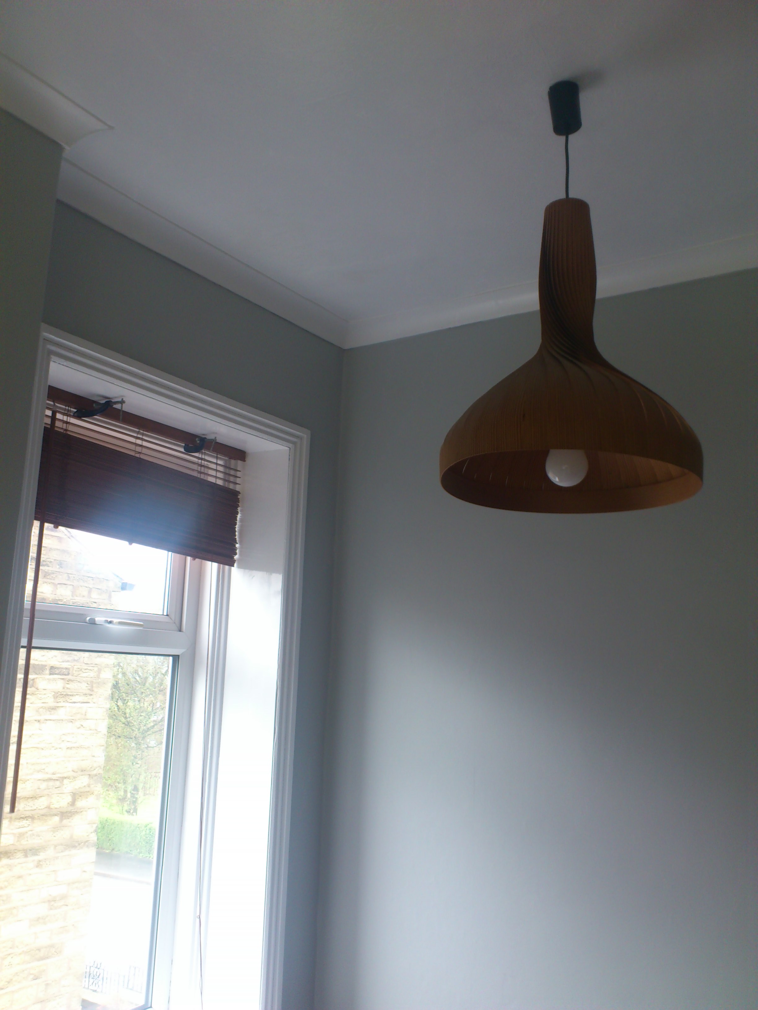 That picture probably shows the true colour more effectively. The lampshade we bought from Germany; the seller told us it was by Arne Jacobsen, but I’ve not been able to track it down. We’ve ordered this bed by Ercol to go in here. Unfortunately, due to the odd L-shape of the bedroom, a king-sized bed won’t fit in there properly. So, it’s back to a double size. The brightly coloured wall is probably going to become a Mid Century Picture wall, a bit like we had in the spare room of our old house. I think the Tretchikoff pictures should look quite effective with that as a backdrop.
