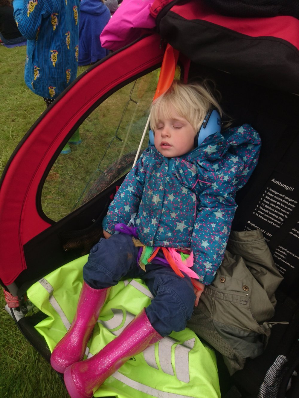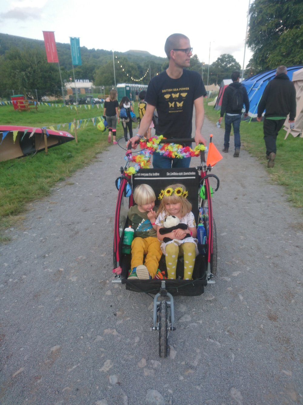 We had borrowed one of those double bike trailer buggies to push the kids round in and out was amazing! I would definitely recommend buying or borrowing one for festivals in the future. It seemed easier to push round than pulling a trailer, and the kids could nap in it too. Also, the boot on it was massive so we could lug all our stuff around with us and smuggle some cans of cider in. Win-win all around.